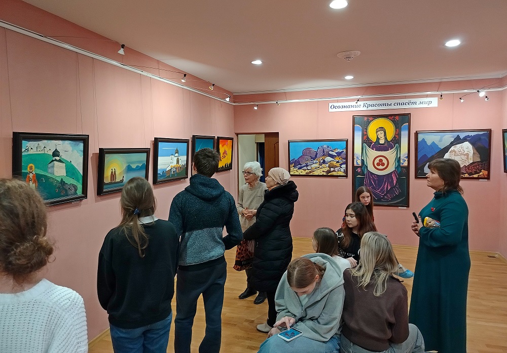 Сотрудница Тверской Рериховской организации В.В. Шушунова провела экскурсии по выставке: познакомила с сюжетами репродукций картин Николая Константиновича и Святослава Николаевича Рерихов, рассказала о детских рисунках, представленных на выставке. Они созданы участниками ежегодного Международного конкурса детского рисунка «Мы – дети Космоса». Конкурс был учрежден в 2016 году Благотворительным Фондом имени Е.И. Рерих и Международным Центром Рерихов для поддержки, развития и популяризации детского художественного творчества, в котором отражается космическое мироощущение, связанное с осознанием красоты. Ведь словом «космос» на греческом языке обозначается красота как высшая гармония.